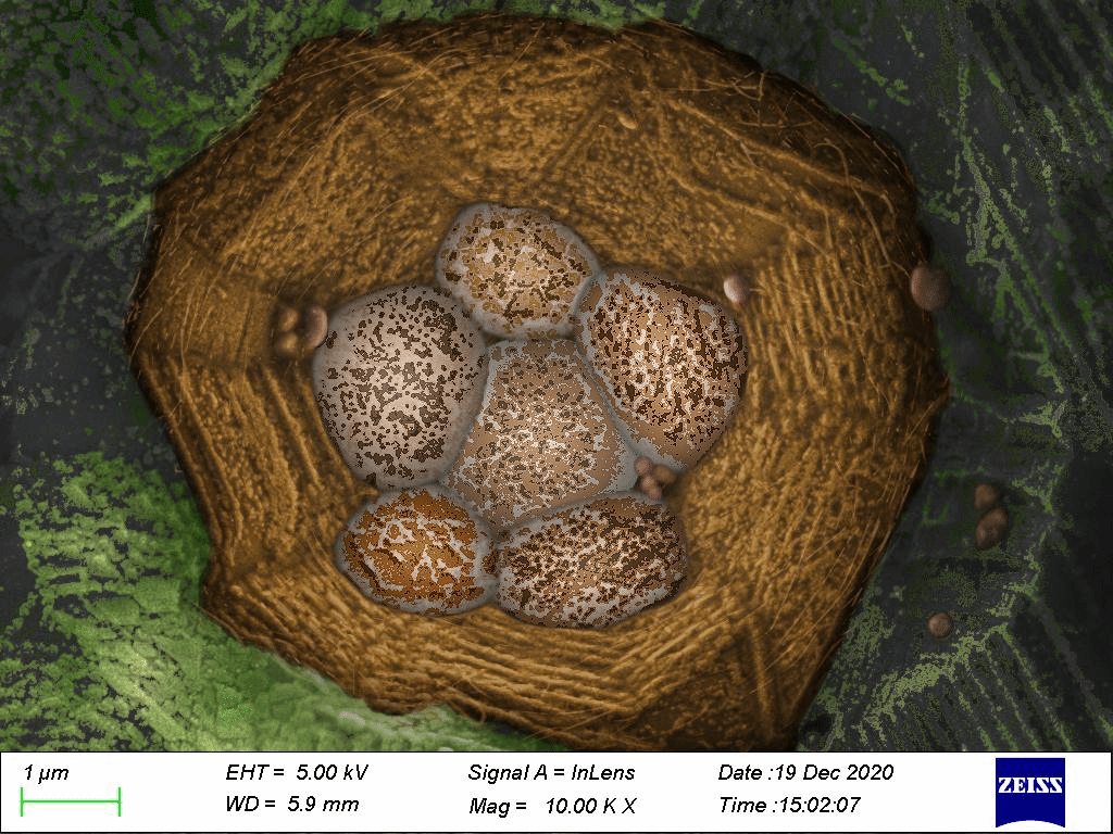 必赢唯一官方网站学生作品《巢》是基于铜锌合金高温煅烧后薄膜样品的扫描电镜原图,利用Photoshop软件,通过抠图、调色、阴影、高光增加了色彩和立体感,用苔藓、鸟巢、鸟蛋、蘑菇四种元素描绘了一幅雨后林中鸟巢静待的画面,鸟蛋的诞生、挫折、等待、破壳的生命历程与科研之路是相似的,喻示了科研工作者坚韧不拔、心怀希望的美好品质。