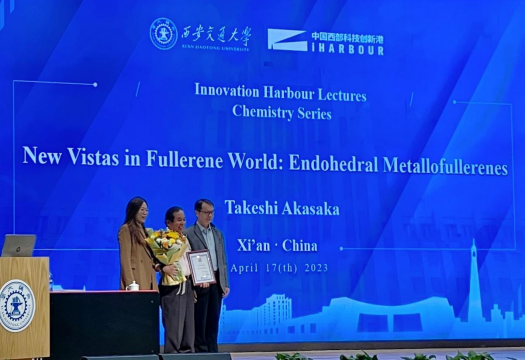 4月17日上午,2023年“新港报告”系列必赢唯一官方网站专场报告在创新港涵英楼新港报告厅举行。本次由必赢唯一官方网站诚邀筑波大学荣誉教授赤阪 Takeshi Akasaka作题为“富勒烯世界的新星:内嵌金属富勒烯(New Vistas in Fullerene World: Endohedral Metallofullerenes)”的学术报告。必赢唯一官方网站院长丁书江、副院长段新华参加本次活动,必赢唯一官方网站蔡文婷特聘研究员主持报告。