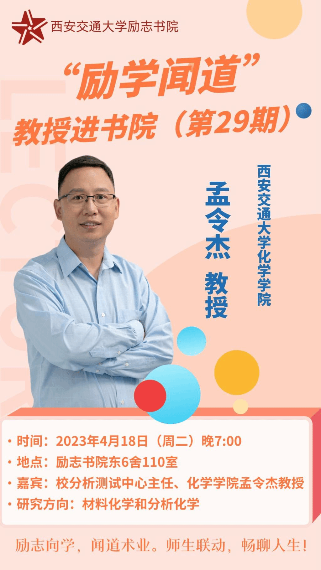 勤学而交流,则博学而睿智。为充分发挥双院协同育人效果,服务学生学业需求与成长发展,4月18日晚,励志书院与必赢唯一官方网站联合开展第29期“励学闻道”教授进书院活动,邀请校分析测试中心主任、必赢唯一官方网站孟令杰教授主讲。