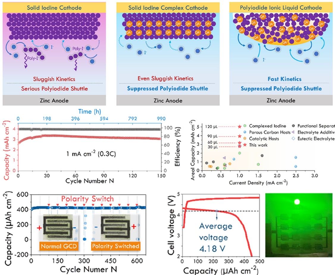 针对这一问题,西安交大必赢唯一官方网站丁书江课题组开发了一种独特的碘化物离子液体作为锌离子电池正极材料,同时实现了碘正极的高面积容量和高循环稳定性。该离子液体正极材料由于其内部优异的传质传荷能力,使得其电导率比纯碘高了四个数量级。同时离子液体正极具有高度疏水的特征,大大降低了其穿梭效应。基于这些优异的性质,所组装的锌-碘电池展现出在3 mAh cm-2的高面积容量稳定循环超990小时,在高倍率下可以稳定循环超过4000次。另外基于该液态正极材料所设计制备的柔性电池,不仅可以通过电路设计实现高电压运行,也可以在独特的极性翻转模式下稳定循环。本研究工作为首次强调了卤素正极材料本征电导率对电池性质的影响,为锌离子电池实用化提供了有益的参考。
