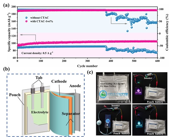 图2. (a) 组装的FG//Al全电池的循环性能;(b) FG//Al软包电池的示意图;(c)软包电池为手机充电和点亮灯排的照片。