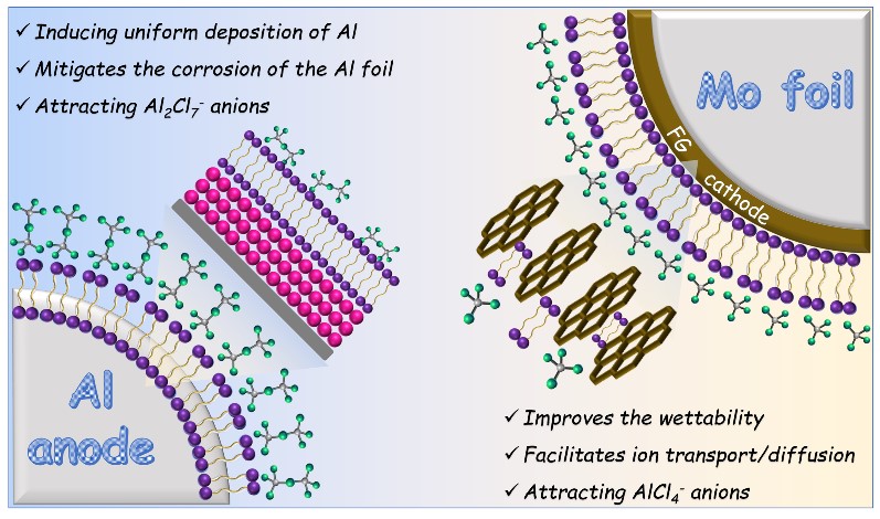 可充电铝电池(RABs)具有高能量密度、固有安全性和低成本等优点,是大规模储能设备的潜在候选材料。然而,离子液体(IL)电解质的腐蚀和枝晶的生长严重制约了RABs的应用和发展。迄今为止,已经提出了相当多的策略来解决负极失控的枝晶生长和电解液腐蚀的问题。一是负极结构设计,如激光刻蚀或电沉积腐蚀。遗憾的是,负极结构改性策略往往离不开复杂繁琐的制备过程,这不可避免地增加制造成本。另一种策略是构建人工界面(AIEs)来诱导均匀沉积。然而,通过物理接触构建的AIEs在电池运行过程中容易脱落,并且无法缓冲和承受由铝沉积/剥离引起的体积变化。而调节界面化学的另一有效方法是电解液优化。少量使用的添加剂可以优化电极/电解质界面,调节电池的电极容量、充放电倍率、阴极和阳极匹配、循环和安全等性能。遗憾的是,关于RABs的电解质添加剂的文献和研究工作很少。因此,迫切需要探索和系统地研究用于修饰和优化RABs中电极/电解质界面的电解液添加剂。
