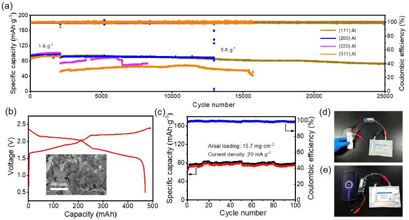 针对这一问题,西安交通大学杜显锋教授等人通过调节铝晶面的择优取向,报道了一种稳定简单的铝电池阳极制备工艺,并证明了具有高晶格匹配的择优晶面生长机制与铝阳极电化学性能之间的相关性。结果表明,这种具有(111)择优晶面的铝阳极在铝的初始成核和生长过程中起着重要作用。用(111Al阳极组装的铝电池具有更稳定的沉积形态和更长的循环寿命,并成功实现了高度可逆的沉积/镀覆、无枝晶和高库仑效率。在5A·g-1的电流密度下,具有(111)择优晶面的铝阳极稳定地进行了25000次循环,容量保持率超过80%。这项工作为高稳定性可充电铝电池的发展开辟了道路,对高安全性储能电池的发展具有重要意义。