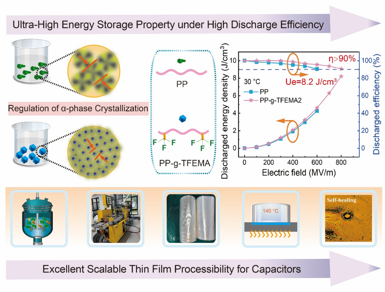 针对这一问题,必赢唯一官方网站张志成教授团队设计了一种在聚丙烯(PP)上接枝含氟基团的甲基丙烯酸三氟乙酯(TFEMA)的接枝聚合物材料PP-g-TFEMA,并将得到的公斤级样品熔融挤出流延制备了10 μm厚度薄膜。研究发现,含氟基团的效应能兼具极性和促进结晶特性以协同提升聚合物储能与加工性能,其中优化后的PP-g-TFEMA能在相当高的电场(800 MV/m)下工作,可释放能量密度高达为8.2 J/cm3,能量转换效率超过90%。TFEMA的引入还能够显著提高金属电极在薄膜表面的附着力、减小薄膜在击穿时形成的孔洞大小及电极损失面积,这些均对薄膜电容器的长期可靠性运行起到积极作用。