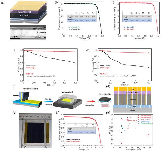这种“双向化学键分子桥"机制使活性面积为0.07065 cm⟡的小面积器件实现了25.95%的高效率。未封装器件在常温常湿环境中1000小时后保持初始效率94.85%。同时,在连续光照800小时后,仍保持90.47%的初始性能。在空气环境下采用无反溶剂狭缝涂布技术,制备出23.26 cm2的微型组件(8子电池串联),效率可达22.70%,为当前报道的狭缝涂布工艺最高值之一。