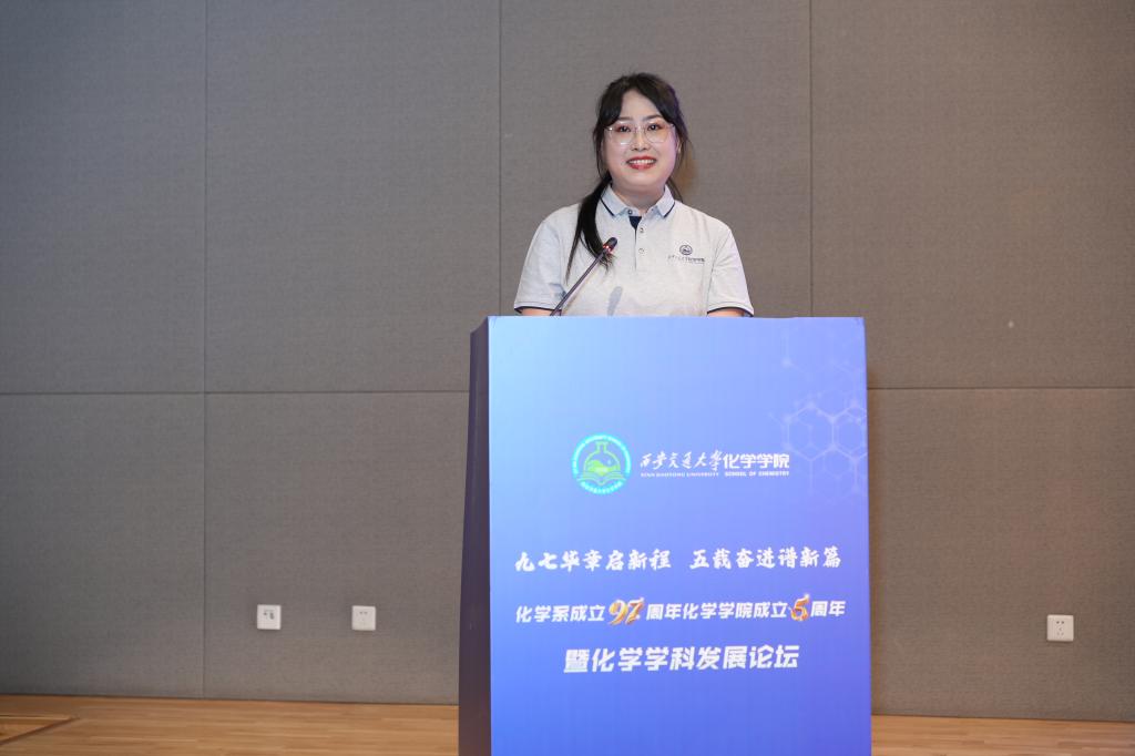 孙泽慧代表新入职青年教师发言。她引用化合自然,学微知彰的学科理念,表示要将个人追求与国家需求相结合,勇攀科研高峰,为科技报国、创新强国目标贡献力量。