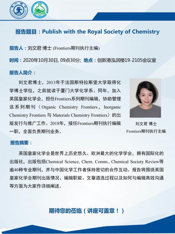 刘文君2013年于法国斯特拉斯堡大学取得化学博士学位,之前就读于厦门大学化学系。同年,她加入英国皇家化学会,担任Frontiers系列期刊编辑,协助管理该系列期刊(Organic Chemistry Frontiers,Inorganic Chemistry Frontiers Materials Chemistry Frontiers)的出版发行与推广工作。2018年,她接任Frontiers期刊执行编辑一职,全面负责期刊业务。