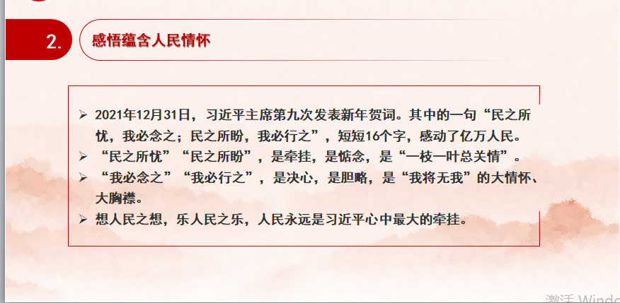 黄晓丽同志带领大家深入学习了习近平总书记新年贺词,感悟蕴含其中的人民情怀。她带领大家逐一解析了习近平总书记的贺词,每一句贺词都彰显了习近平总书记心系民生冷暖,彰显出总书记深厚的爱民情怀。德莫高于爱民。多年来,“人民”二字在习近平主席心中重若千钧,始终坚持“以百姓之心为心”,对人民怀有深厚的感情,把老百姓的安危冷暖时刻放在心上,每一次新年贺词的为民情怀都让人动容,令人倍感温暖和振奋。