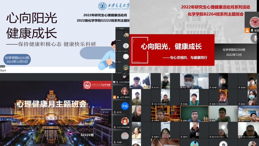 我院针对2022级新生硕士特举办主题为“心向阳光 健康成长”的主题班会。通过班级学生干部充分发挥朋辈互助的优势,以达到宣传心理健康知识,倡导健康生活方式,提高学生心理保健能力的目的。本次线上+线下主题班会累计120余人参加,班会结束后,各新生班级心理委员及时组织本班同学进行活动总结,班内学生积极发表关于心理健康的认知和看法,达到了良好的宣传目的。