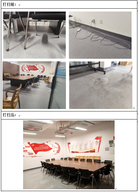 在这次活动中,我们分配的项目是让一间闲置的会议室变得干净整洁。虽然听起来是一件普普通通的事,但整个过程下来,我享受其中,享受议室变化后的干净整洁,享受认真做事,全身心投入的个人状态,享受做了一件有意义的事以后的喜悦感。在整理过程中,我甚至设想到,在今天之后使用这间会议室的老师或者同学们,在这样干净整洁的环境里,是不是能迸发出更强的力量,提出更多更好的想法。想到这里,手中的进度都会不知不觉的加快,只为了更快更好的完成整理,为会议室迎来“新生”。