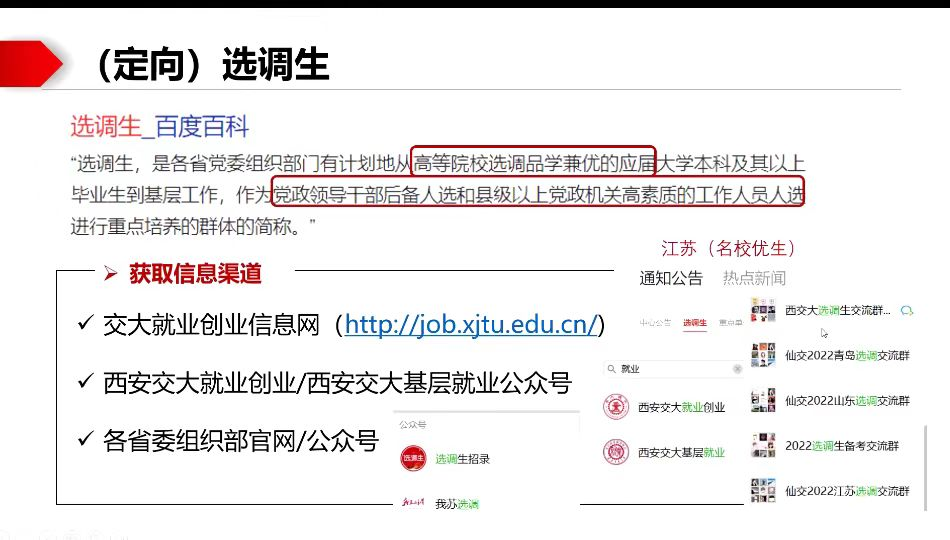樊星,研究生三年级,她曾任硕9103班党支部书记、院研会宣传部部长,现已成功被录取为江苏省选调生。“大厂、体制还是升学?”樊星师姐开篇便建议师弟师妹们提前做好自己的职业规划,并朝着这个方向做一些相关准备,以免找工作时手足无措,错失良机。随后,师姐详细地为大家详细地梳理并解读了选调生政策与流程,并分享了自己备考选调生的复习技巧和相关学习软件,为将来有意愿走选调的同学们提供了很多宝贵的信息。“密关公告、细研政策、整合信息、放平心态、科学备考”。