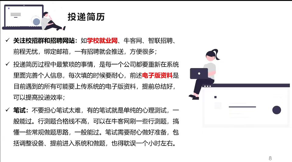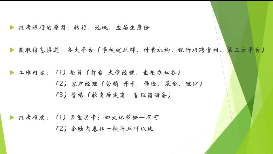 陈肖肖,研究生三年级,她即将入职中国工商银行陕西省分行。从化学专业跨专业到银行,陈肖肖先为大家详细介绍了银行分类及岗位介绍,让大家对银行的结构与性质有了更多的了解。然后再以自身经验出发,分享了她的岗位申请流程,主要包括报名、笔试、面试、体检、签约这五大部分。整个岗位申请流程漫长,师姐建议大家最好时间规划,充分利用时间。最后,她鼓励大家结合自己的性格特点,发展兴趣,着眼现在,放眼未来,启发同学们对自身做一场深入彻底的剖析,了解自己真正的工作愿景。